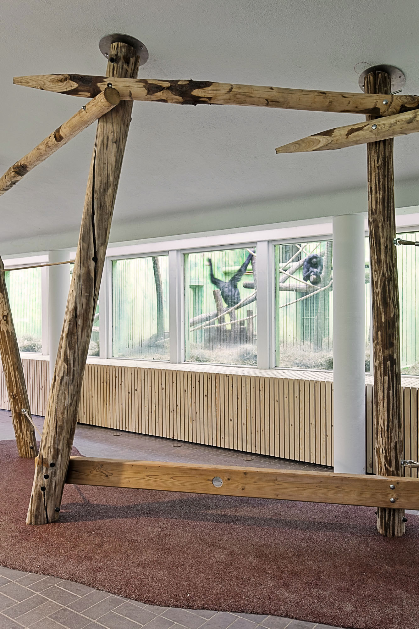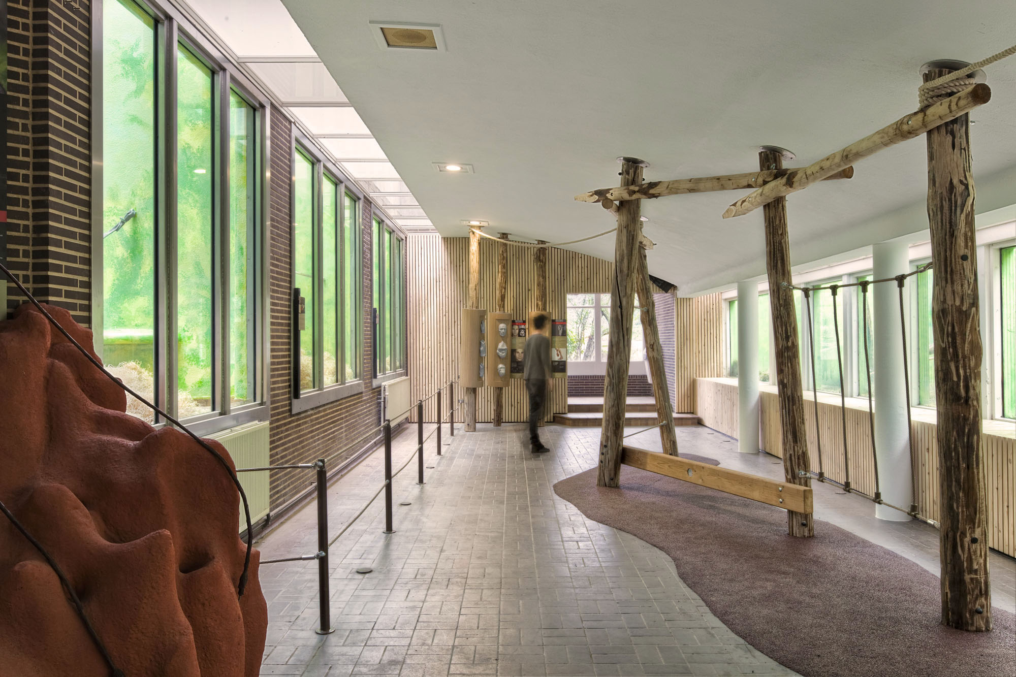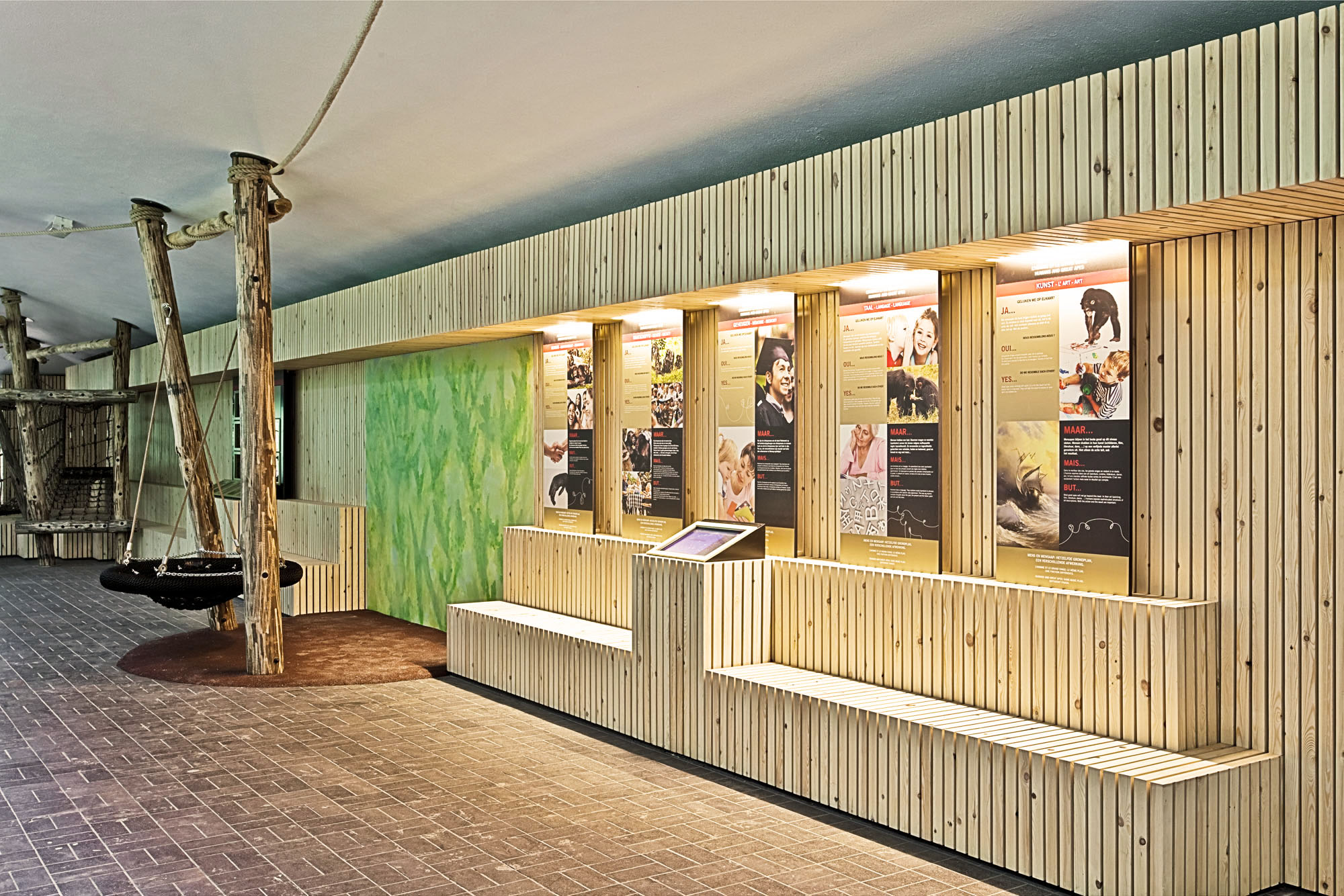 The new interior is warm and inviting through the use of natural materials like wood, hemp rope and hard soil. Poles like trees sway through the space and bring the environment of the monkeys into the visitor’s space and function as carrier for ropes, tires and information panels. A long wall, made up of hundreds of thin wooden boards, is shaped as an horizontal landscape unfolding, solving not only the acoustic problem but also the need for seating and place for interaction and presentation.