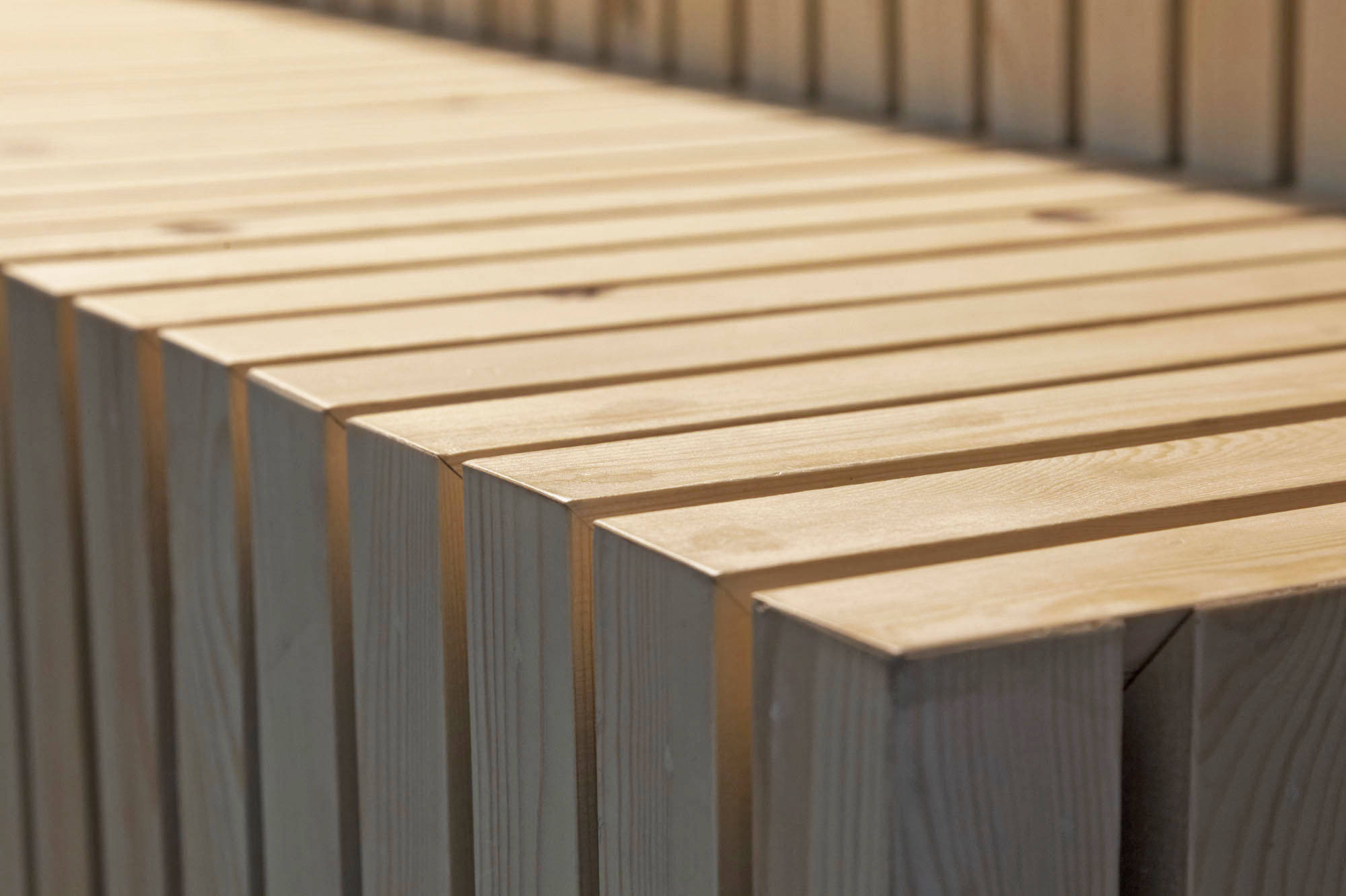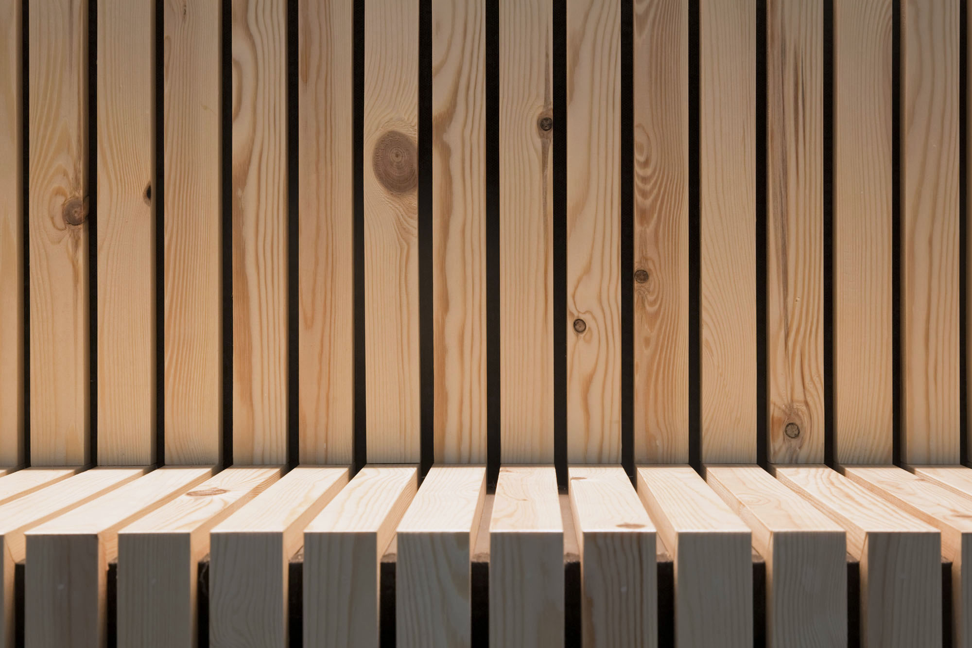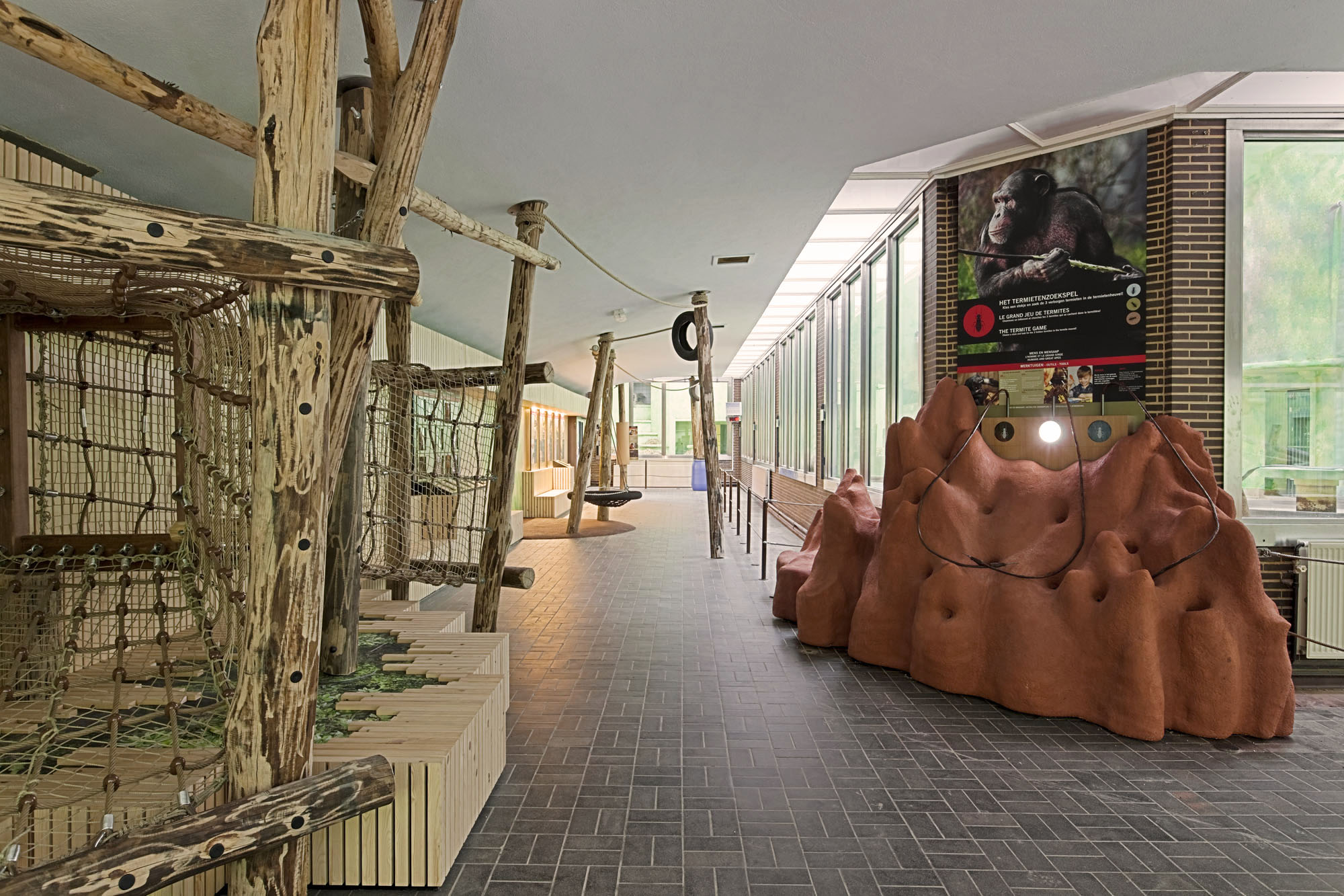 The new interior is warm and inviting through the use of natural materials like wood, hemp rope and hard soil. Poles like trees sway through the space and bring the environment of the monkeys into the visitor’s space and function as carrier for ropes, tires and information panels. A long wall, made up of hundreds of thin wooden boards, is shaped as an horizontal landscape unfolding, solving not only the acoustic problem but also the need for seating and place for interaction and presentation.