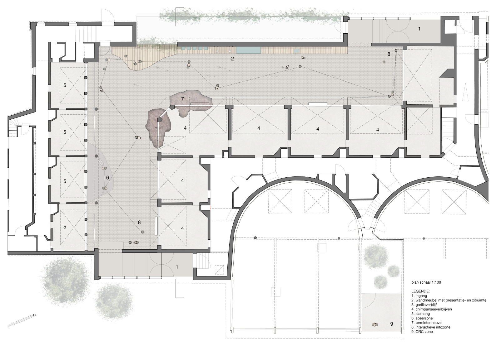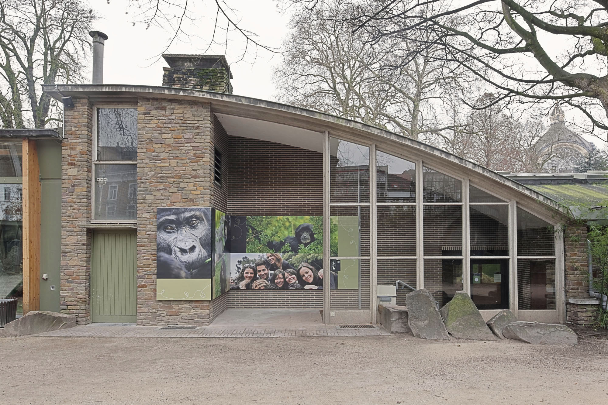 In the recent transformation of the Zoo of Antwerp the older pavilion of the apes needed urgent intervention. Entering the barren spaces with terrible acoustics was a monotonous and cheerless experience.